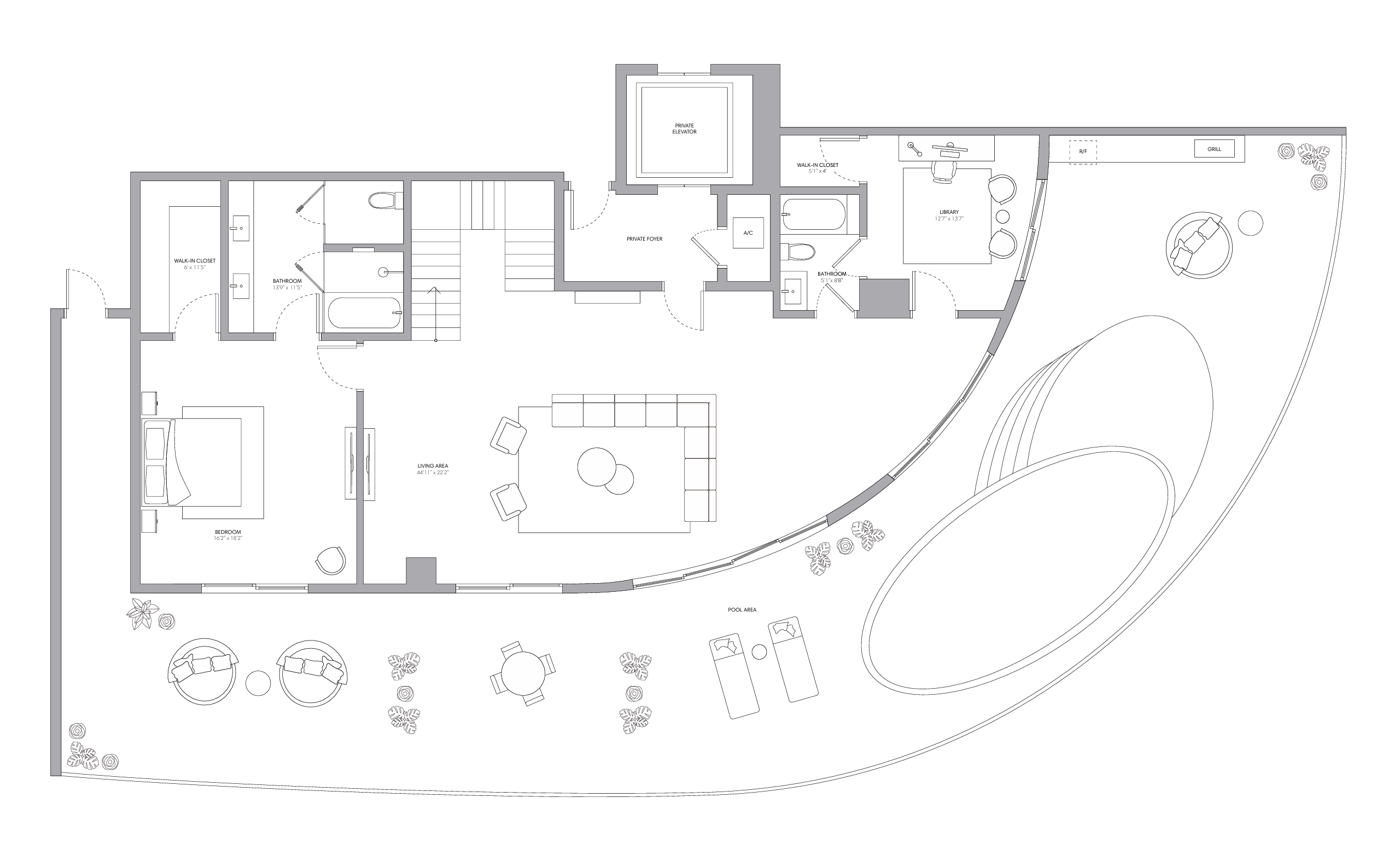 • Residents’ club room, movie theater, and private bar